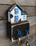 Mały wieszaczek na klucze - na belce stoi biały domek z niebieskimi okienkami, a poniżej zamontowane są dwa haczyki na klucze.