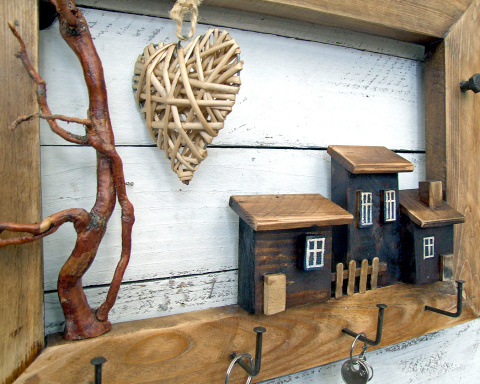 Drewniana ramka z domkami - wieszak na klucze i drobiazgi