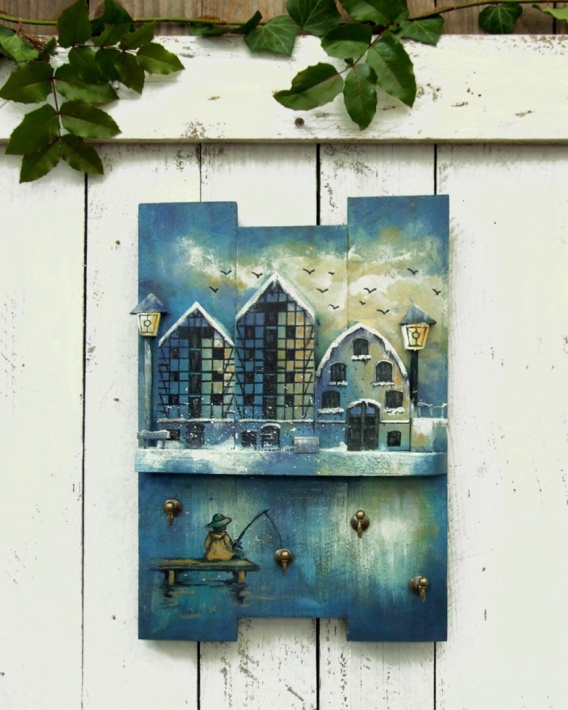 Tło malowane na deskach, a na pierwszym planie przestrzenne domki - spichrze i latarnia. Niebieska tonacja, przetarta beżowym i żółtym kolorem sprawia, że obraz kojarzy się z rześkim porankiem.