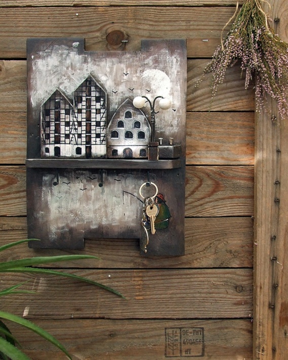 Tło malowane na deskach, a na pierwszym planie przestrzenne domki - spichrze i latarnia. Ciemnobrązowa tonacja, przetarta białym i beżowym kolorem, jakby trochę zamglona - buduje nastrój starego miasta nad rzeką, wyjątkowego i klimatycznego miejsca, idealnego na popołudniowy spacer.
