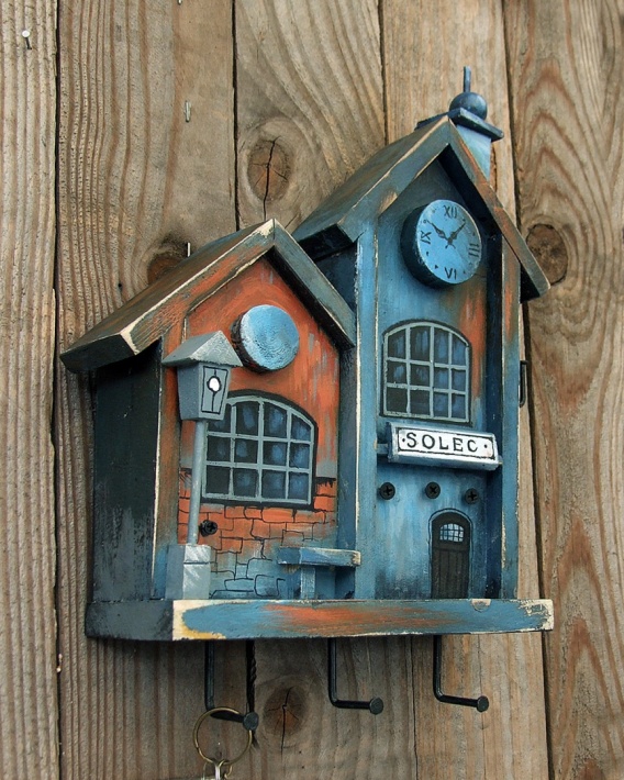 Wieszak to dwa domki, które nawiązują do architektury starego dworca kolejowego: Duże namalowane okna, zegar na szczycie budynku i latarnia tworzą wyjątkowy i tajemniczy klimat tej pracy. Całość jest zabezpieczona matowym lakierem akrylowym.