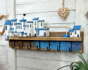 Duży wieszak na odzież, wykonany ze starych sosnowych desek i belek - białe domki z niebieskimi daszkami stoją ciasno obok siebie - to jakby uliczka na nabrzeżu w nadmorskim miasteczku.