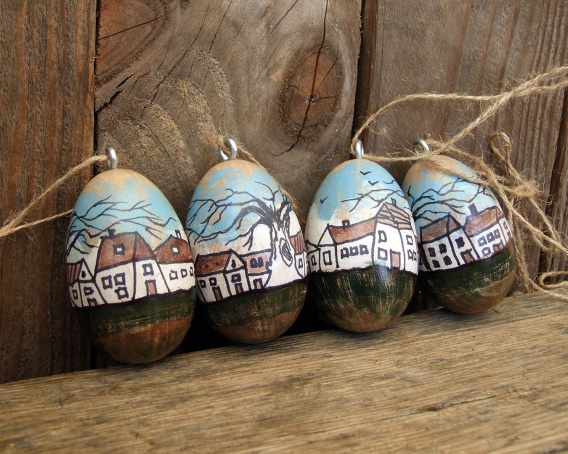 Komlet 4 pisanek-zawieszek. Drewniane, ręcznie malowane - seria Miasteczko