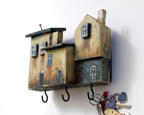 Drewniany wieszaczek z domkami - na klucze, biżuterię, albo inne drobiazgi które chcesz uporządkować.