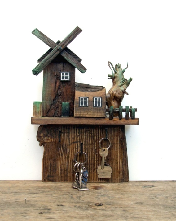 Drewniany wieszaczek na klucze, z młynem i starą wierzbą.